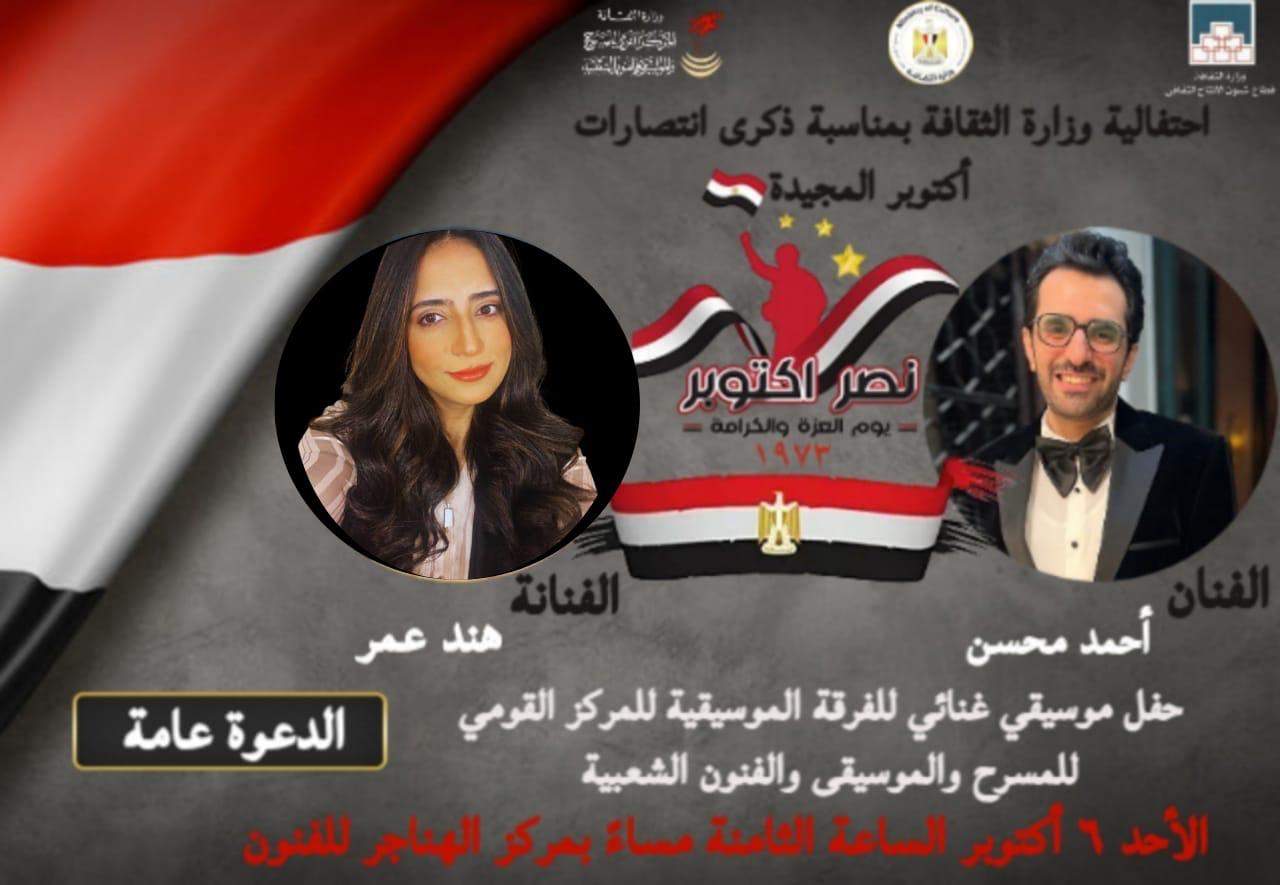 يقيم المركز القومي للمسرح والموسيقى والفنون الشعبية بقيادة الفنان إيهاب فهمي؛ بمناسبة ذكرى انتصارات أكتوبر المجيدة، حفلا موسيقيا غنائيا لفرقة المركز الموسيقية بإشراف الفنانة رانيا عمر، وقيادة المايسترو أحمد ماهر، وذلك في الثامنة مساء غدٍ الأحد، بمسرح الهناجر، في إطار توجيهات الدكتور أحمد فؤاد هنو وزير الثقافة؛ لإحياء الذكريات الوطنية العظيمة، وتحت إشراف رئيس قطاع شئون الإنتاج الثقافي المخرج الكبير خالد جلال.