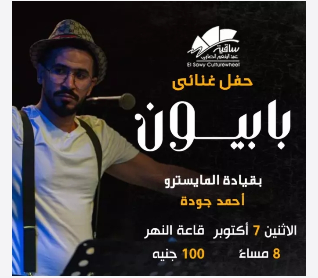 تستقبل ساقية عبد المنعم الصاوي، حفل غنائي لفرقة بابيون بقيادة المايسترو أحمد جودة، في الثامنة  مساء الاثنين المقبل بقاعة النهر، وسعر التذكرة ١٠٠ جنيه.