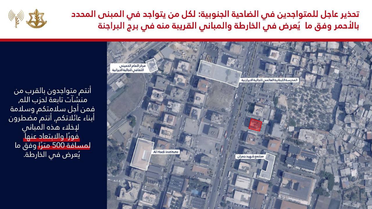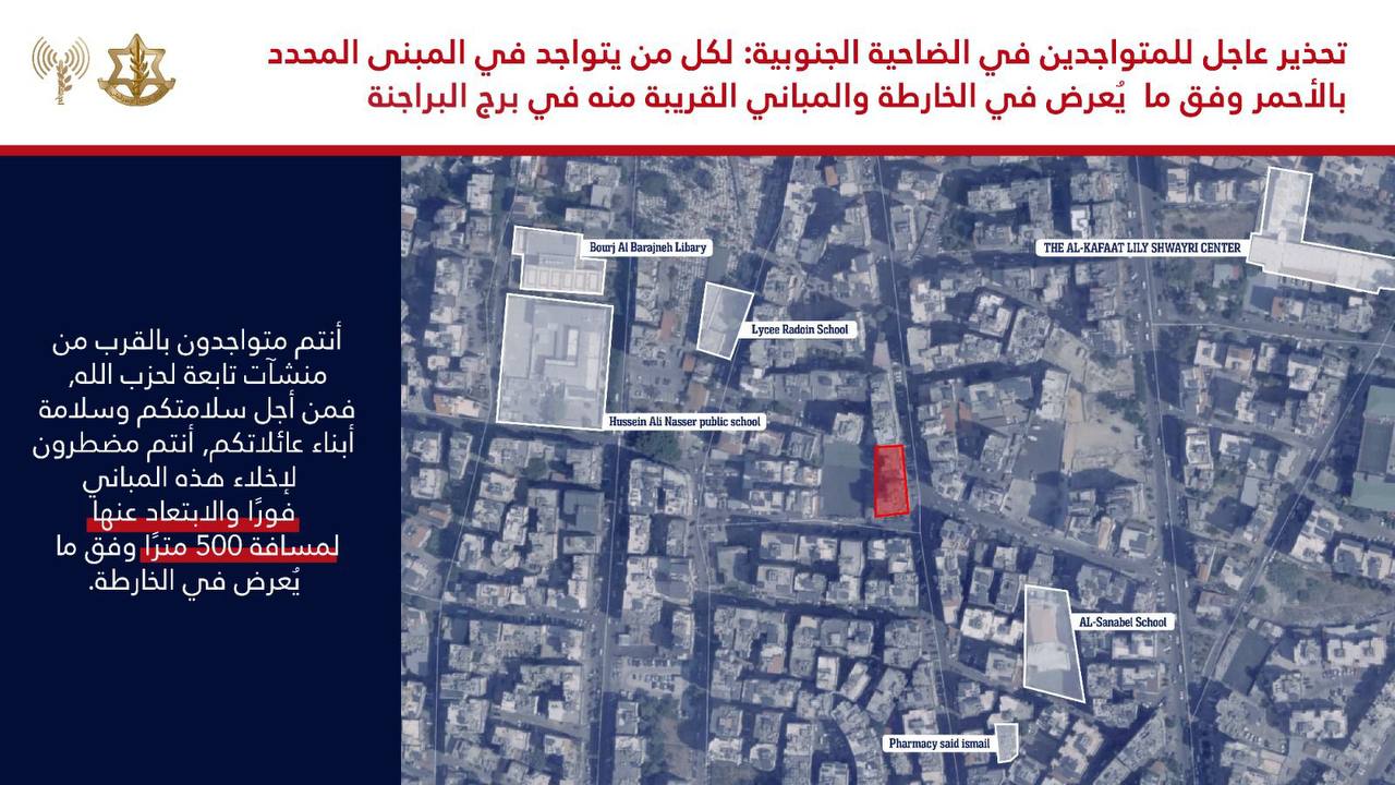 أمر جيش الاحتلال الإسرائيلي، سكان الضاحية الجنوبية في لبنان، وتحديدًا المتواجدين في مباني محددة في برج البراجنة، بإخلاء منازلهم فورا .