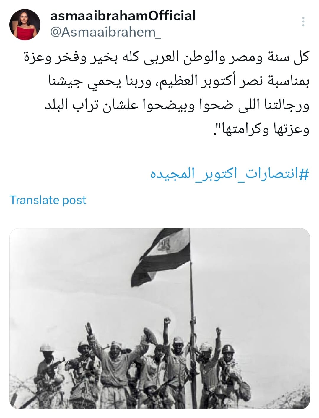 وقالت أسما، في تدوينه أخرى: "كل سنة ومصر والوطن العربي كله بخير وفخر وعزة بمناسبة نصر أكتوبر العظيم، وربنا يحمي جيشنا ورجالتنا اللي ضحوا وبيضحوا علشان تراب البلد وعزتها وكرامتها".