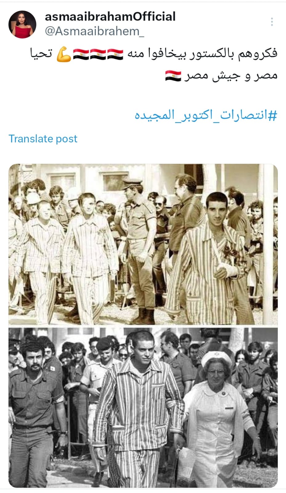 وشاركت أسما، جمهورها صورة للجنود الإسرائيليين الأسرى في حرب أكتوبر وهم عائدون بالبيجامات الكستور، وعلقت عليها قائلة: "فكروهم بالكستور بيخافوا منه، تحيا مصر وجيش مصر".