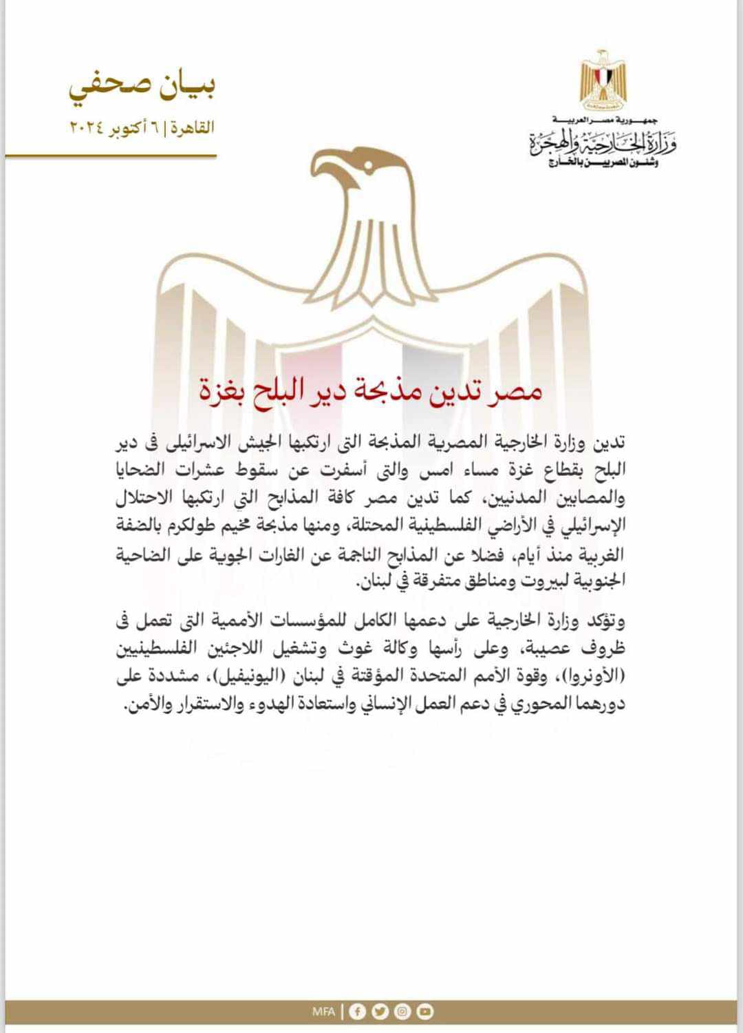 تدين وزارة الخارجية المصرية المجزرة التي ارتكبها جيش الاحتلال الإسرائيلي في دير البلح بقطاع غزة مساء أمس، التي أسفرت عن سقوط عشرات الضحايا والمصابين من المدنيين.