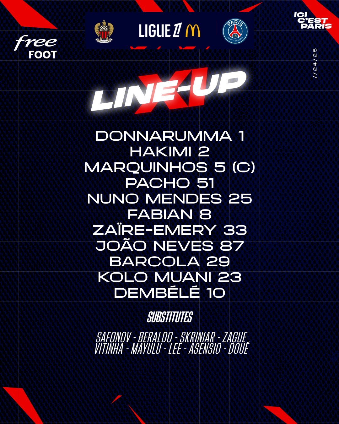 أعلن الجهاز الفني للفريق الأول لكرة القدم بنادي باريس سان جيرمان، التشكيل الرسمي لمواجهة نيس، ضمن منافسات الدوري الفرنسي لهذا الموسم 2024/2025.