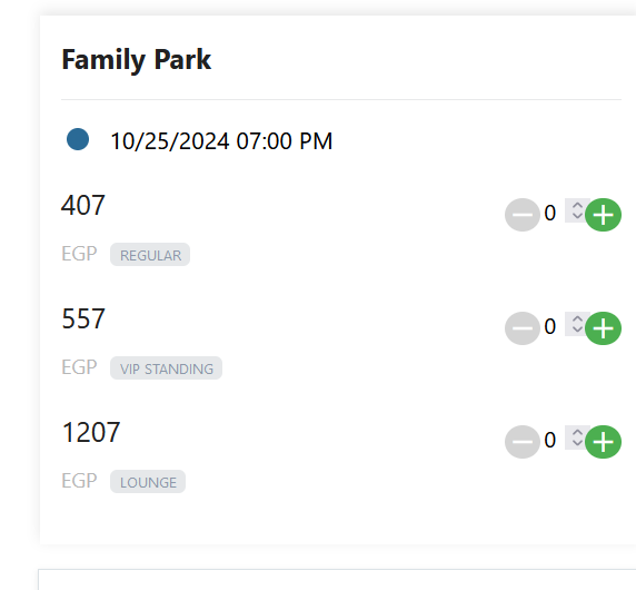 قسمت أسعار التذاكر إلى 3 فئات: الاولى “جلوس” بـ 1200 جنيه، الثانية “وقوف” 550 جنيه، الثالثة والأخيرة “وقوف” 400 جنيه.