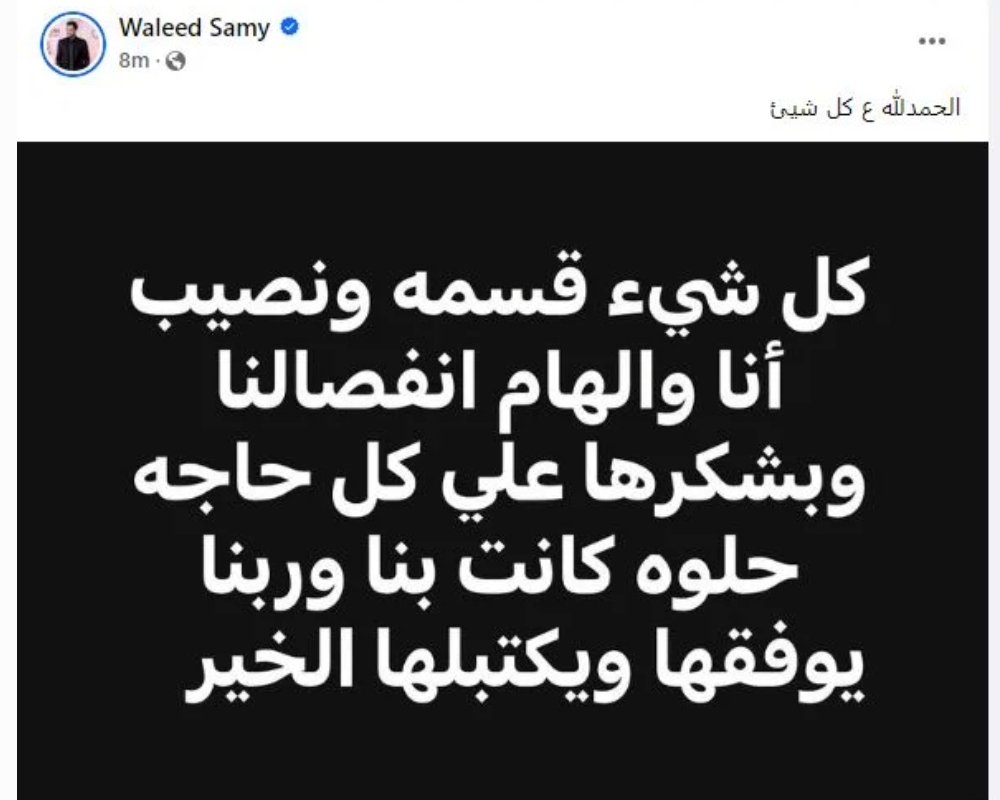 وكتب وليد سامي، عبر صفحته قائلًا : "كل شيء قسمة ونصيب أنا والهام انفصلنا وبشكرها على كل حاجة حلوة كانت بينا وربنا يوفقها ويكتبلها الخير".
