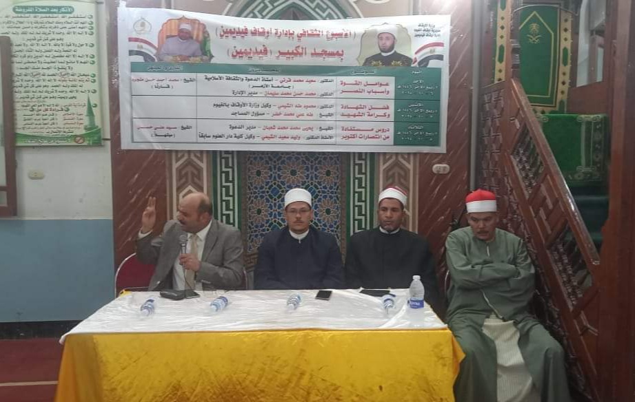 جاء ذلك تنفيذا لتوجيهات الدكتور أسامه السيد الأزهري وزير الأوقاف وتحت إشراف الدكتور محمود الشيمي وكيل وزارة الأوقاف بالفيوم، وبحضور الدكتور وليد الشيمي وكيل كلية دار العلوم بالفيوم سابقا محاضرا، وفضيلة الشيخ يحيى محمد مدير إدارة الدعوة بالمديرية محاضرا، وفضيلة الشيخ أحمد رجب إمام المسجد مقدما.