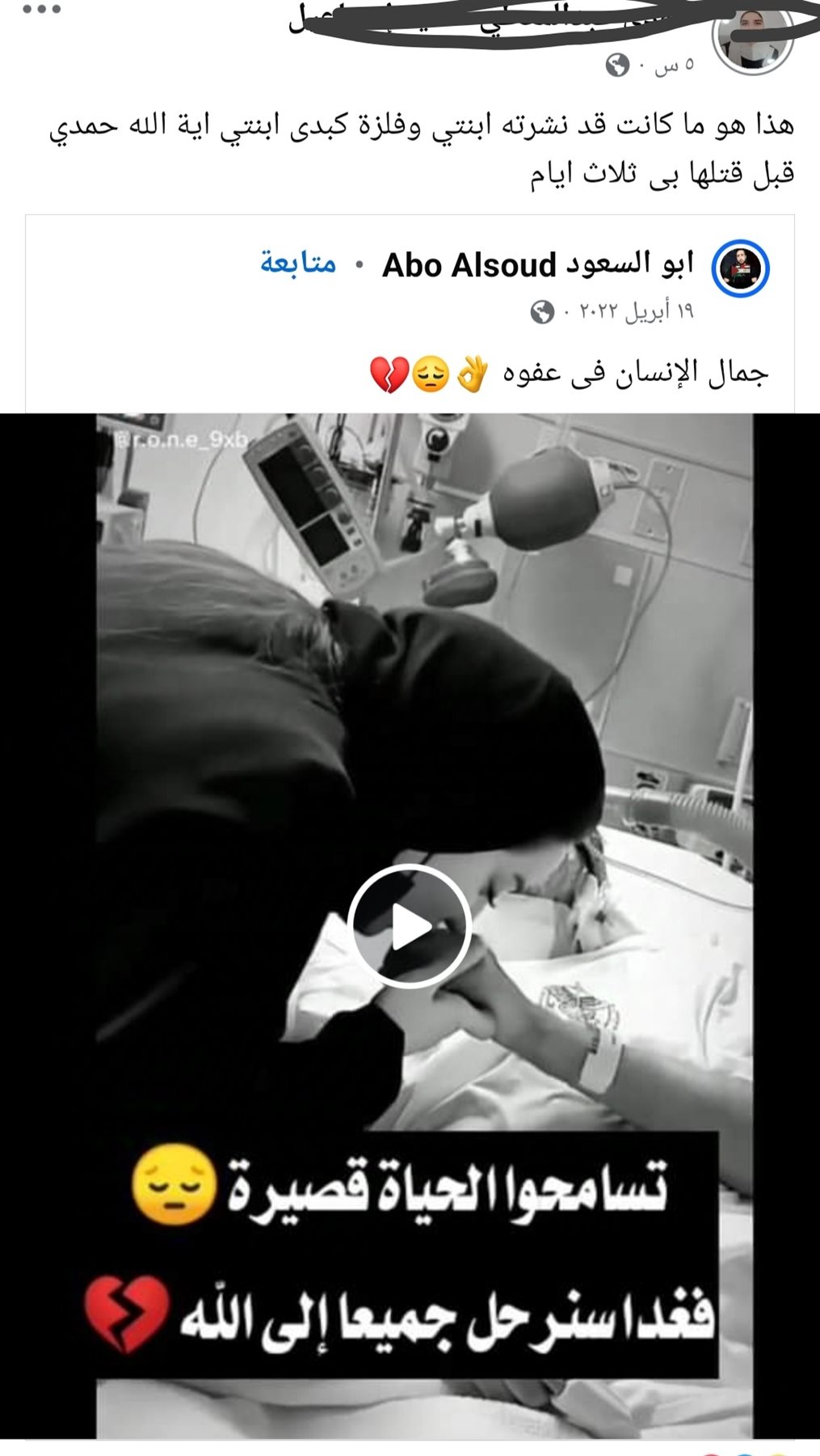 ويتابع الأب المكلوم يوم الاحد الماضي حضر متأخّر كا عادته قالت له لما تاخرت ان تاخرات سوف أقول السر الي اهلي  فا ما كان منه الا ان اتى  بأله حاده وضربها على راسها من الخلف،ثم قام بخنقها حتي فرقت الحياة افوض الامر لله»