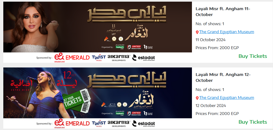 تغني أنغام أغاني ألبوم تيجي نسيب على مدار يومي الجمعة والسبت 11 و 12 أكتوبر الجاري على مسرح المتحف المصري الكبير، وقد أقيمت الليلة الثانية نظرا للإقبال الجماهيري الضخم على الأول لاستيعاب أكبر عدد من جمهورها.