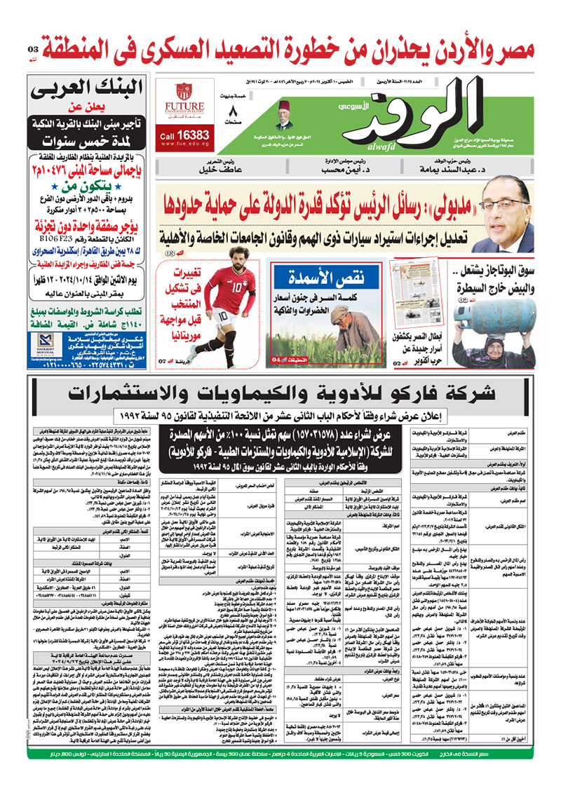 تنشر جريدة الوفد في عددها الصادر، غدًا الخميس، الكثير من الموضوعات والتقارير الإخبارية المهمة، أبرزها: "مصر والأردن يحذران من خطورة التصعيد العسكري في المنطقة".