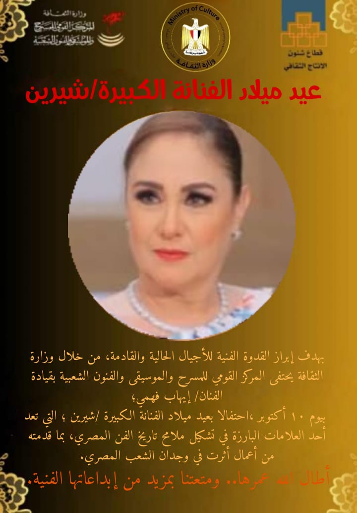 ويأتي الاحتفاء بهدف إبراز القدوة الفنية للأجيال الحالية والقادمة، وتخليدًا لـ الفنانة الكبيرة شيرين، وتعد هي أحد العلامات البارزة في تشكيل ملامح الفن المصري، بما قدمته من أعمال أثرت في وجدان الشعب المصري.