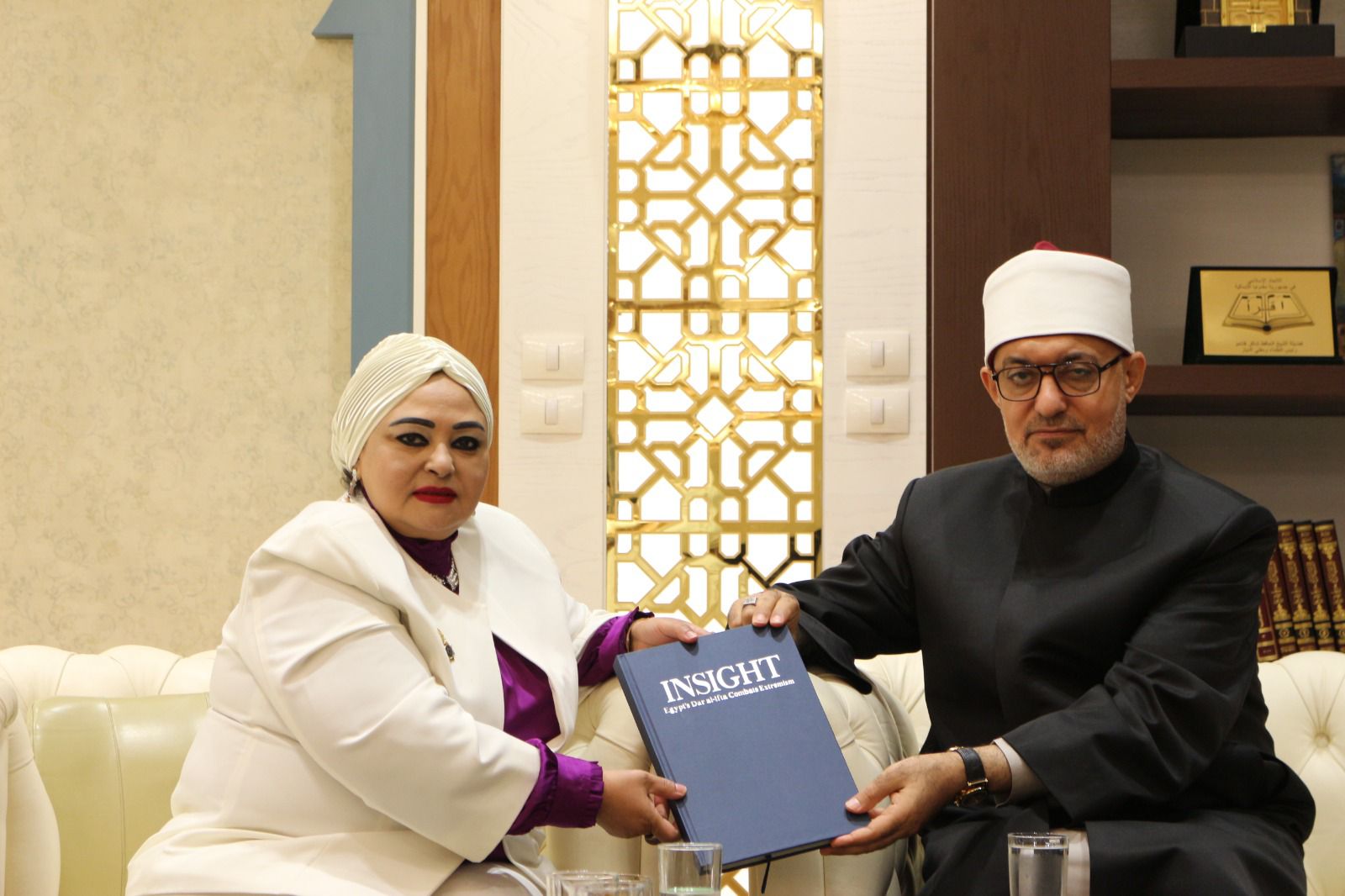 وفي ختام اللقاء، أهدت الدكتورة مشيرة أبو غالي فضيلة المفتي وسام "فارس بناء الوعي العربي" تقديرًا لجهوده الكبيرة في نشر الفكر الوسطي وبناء الوعي. من جانبه، أهدى فضيلته الدكتورة مشيرة درع الأمانة العامة لدور وهيئات الإفتاء في العالم.