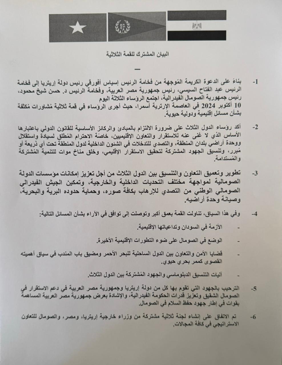 ختاماً.. أود أن أكرر الشكر.. لفخامة الرئيس "إسياس أفورقي".. على كرم الضيافة.. ولفخامة الرئيس "حسن شيخ محمود".. على المشاركة في قمتنا الثلاثية الأولى اليوم.. وأتطلع لمواصلة التنسيق بيننا بصفة دورية.. بما يحفظ مصالحنا وأهدافنا المشتركة.. كما أجدد تأكيدي على أن مصر لن تدخر جهداً.. ولن تبخل بالمشورة.. في خدمة أهداف ومصالح وتطلعات دولنا وشعوبنا.. بمنطقة القرن الإفريقي.. من أجل مستقبل أكثر أمانًا واستقراراً وازدهاراً.. ونتطلع لرؤيتكم.. في وطنكم الثاني مصر.. في المستقبل القريب.