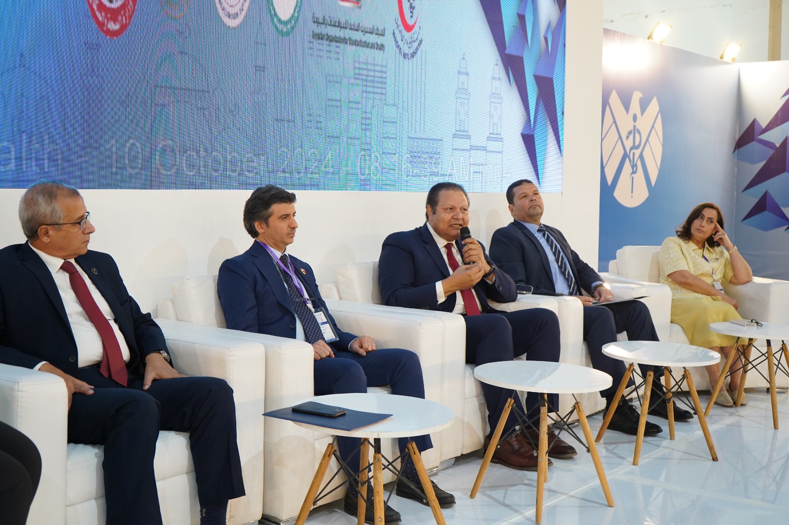 شارك في الجلسة الحوارية: د. حازم خميس، د. ايمن الخطيب، نائب رئيس الهيئة المصرية للدواء، د. أحمد الأنصاري، الرئيس التنفيذي للهيئة الوطنية لتنظيم المهن والخدمات الصحية بدولة البحرين، د. مريم الجلاهمة، الرئيس التنفيذي للمستشفيات الحكومية بدولة البحرين، د. إيهاب أبو عيش، نائب رئيس الهيئة العامة للتأمين الصحي الشامل