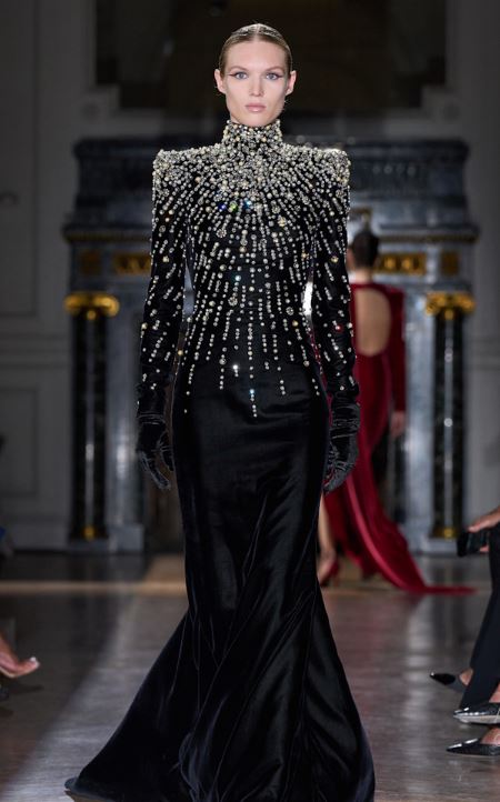 وقد تفنن المصممون العرب في تزيينها بطرق رائعة ستجعلك تستغنين عن ارتداء المجوهرات، فقد رصدنا من مجموعة المصمم زهير مراد Zuhair Murad فستاناً رائعاً مصمماً من المخمل الأسود على شكل حورية البحر، تميز بياقته العالية والتطريز فائق الدقة الذي زيّن القسم العلوي منه، التصميم الذي زود بقفازات من نفس الخامة واللون، ننصحك بتنسيقه مع توربان ساتان أسود، وانتعلي حذاء أسود سادة، واحملي حقيبة كلاتش فضية صغيرة.