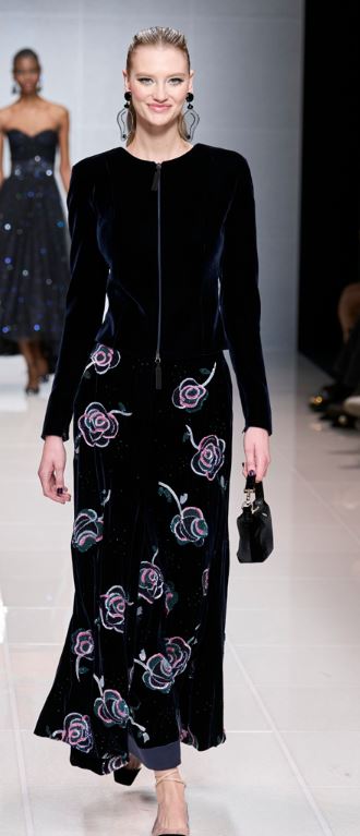ما لا شك فيه ان مازالت موضة فساتين السهرة المؤلفة من قطعتين تستحوذ على اهتمام المصممين، وهذا ما لاحظناه في تصميم الفستان المخمل المحتشم المصمم بمزيج من الأسود والأزرق الداكن Navy Blue من مجموعة جورجيو أرماني Giorgio Armani.