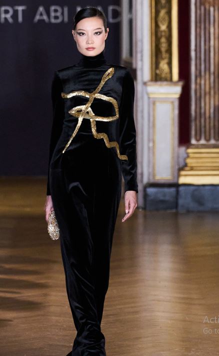 واحضرنا لكٍ فستان مخمل المصمم بياقة مرتفعة والمزدان بالأفعى الذهبية من الأمام من مجموعة المصمم روبير أبي نادر Robert Abi Nader، وننصحك بتنسيقه مع توربان ساتان ذهبي سادة، وانتعلي حذاء أسود سادة، وتممي اللوك بحقيبة صغيرة مرصعة بتطريزات ذهبية وفضية.