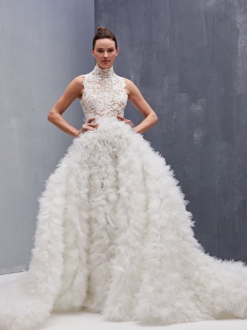 نجحت فساتين الزفاف المصممة بتنانير ضخمة مغطاة بالكشاكش في نيل الإعجاب لتتصدر مجموعات خريف 2025، وقدمت ماركة بيتر لانغنر Peter Langner واحد من أجمل التصاميم التي رأيناها خلال الأيام الأولى من أسبوع نيويورك، فقد تميز بالتوب الدانتيل المصمم بياقة مرتفعة، ننصحك بتنسيقه مع حذاء أبيض سادة، واكتفي بارتداء أقراط من الذهب الأبيض المرصع بالألماس واللؤلؤ.