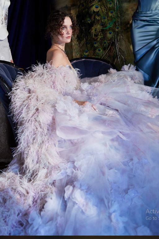 والان نقدم لكٍ فستان الليلك الطبقات المزود بكاب من الريش الناعم الذي أطلت به عارضة ماركة إينيس دي سانتو Ines Di Santo، جربي تنسيقه مع حذاء فضي سادة خالٍ من التطريز، وارتدي قلادة عريضة وقصيرة من الذهب الأبيض المرصع بالألماس.