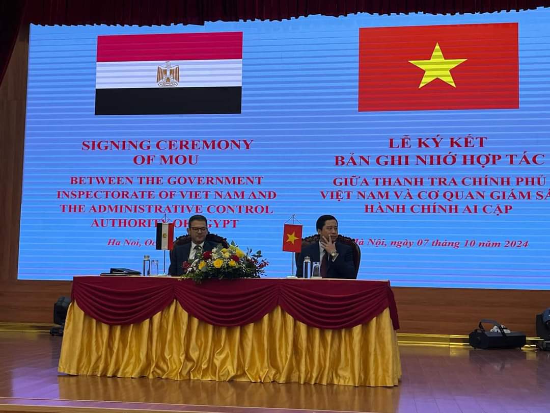 وقع المستشار تامر فرجاني، نائب رئيس هيئة الرقابة الإدارية مذكرة تفاهم مع Duong Quoc Huy نائب رئيس مفتشي الحكومة الفيتنامية خلال زيارة وفد الهيئة لدولة فيتنام .