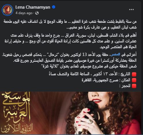تسببت الفنانة السورية لينا شاماميان في جدل كبير على مواقع التواصل الاجتماعي، بعد أن كشفت للجمهور موقفها من اعتذار النجوم عن المشاركة لمهرجان الموسيقى العربية، إذ كتبت منشور عبر حسابها الرسمي على فيسبوك قائلة :" من سنة بالظبط بلشت ملحمة شعب غزة العظيم وما وقف الوجع لا بل انضاف عليه اليوم ملحمة شعب لبنان العظيم، و مين عارف بكرة شو مخبي".