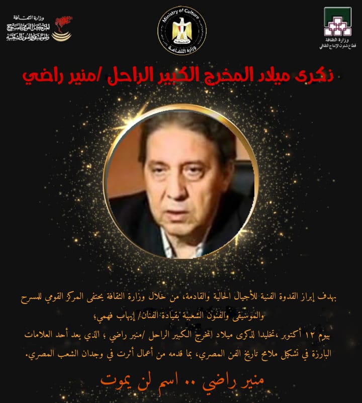 يحيي المركز القومي للمسرح والموسيقى والفنون الشعبية برئاسة الفنان إيهاب فهمي، اليوم السبت، بذكرى ميلاد المخرج الكبير منير راضي.