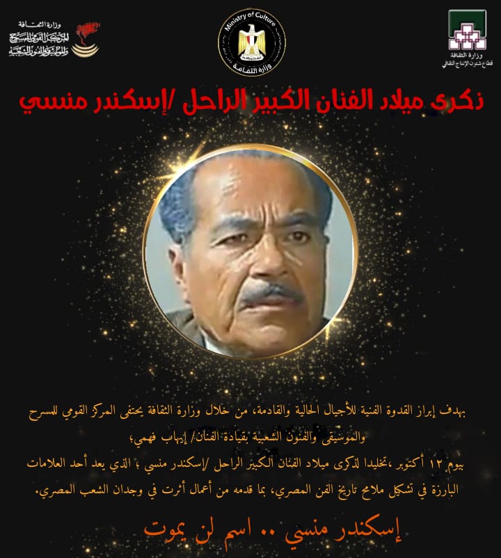 يحيي المركز القومي للمسرح والموسيقى والفنون الشعبية برئاسة الفنان إيهاب فهمي، اليوم السبت، بذكرى ميلاد الفنان الكبير إسكندر منسي.