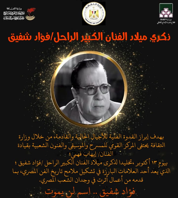 يحيي المركز القومي للمسرح والموسيقى والفنون الشعبية برئاسة الفنان إيهاب فهمي، اليوم الاحد، بذكرى ميلاد الفنان الكبير فؤاد شفيق.