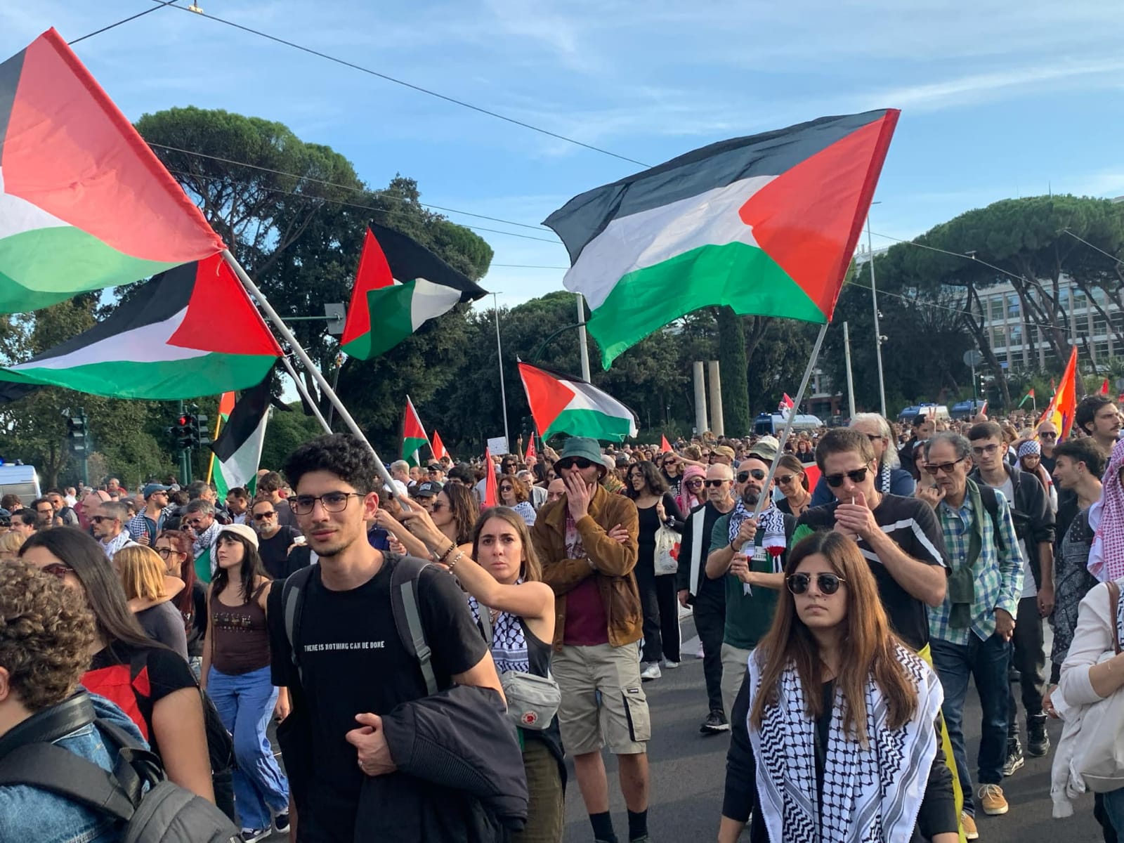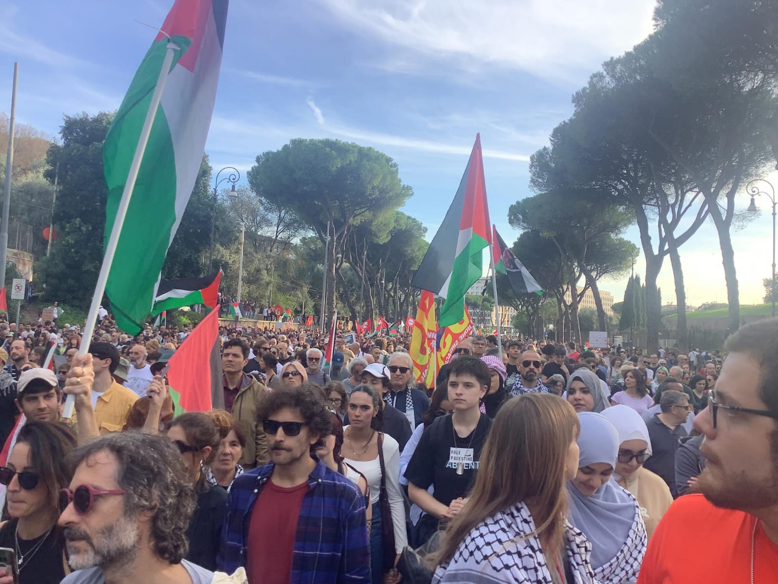 وكانت المظاهرة قد إنطلقت في الثالثة بعد ظهر السبت 12 أكتوبر من ساحة أوستينزي في قلب العاصمة روما حمل فيها المشاركون لافتات منادية بالحرية للشعب الفليسطيني وعبارات مطالبة بوقف حرب الإبادة ضد أبناء غزة كما حمل طلاب الجامعات والمدارس الإيطالية لافتات منددة برئيسة الحكومة الإيطالية " ميلوني " وصورا لها ولرئيس الوزراء الإسرائيلي " نيتنياهو " ووجوههما ملطخة بالدماء و قدر عدد المشاركين بحوالي 6 آلاف شخص .