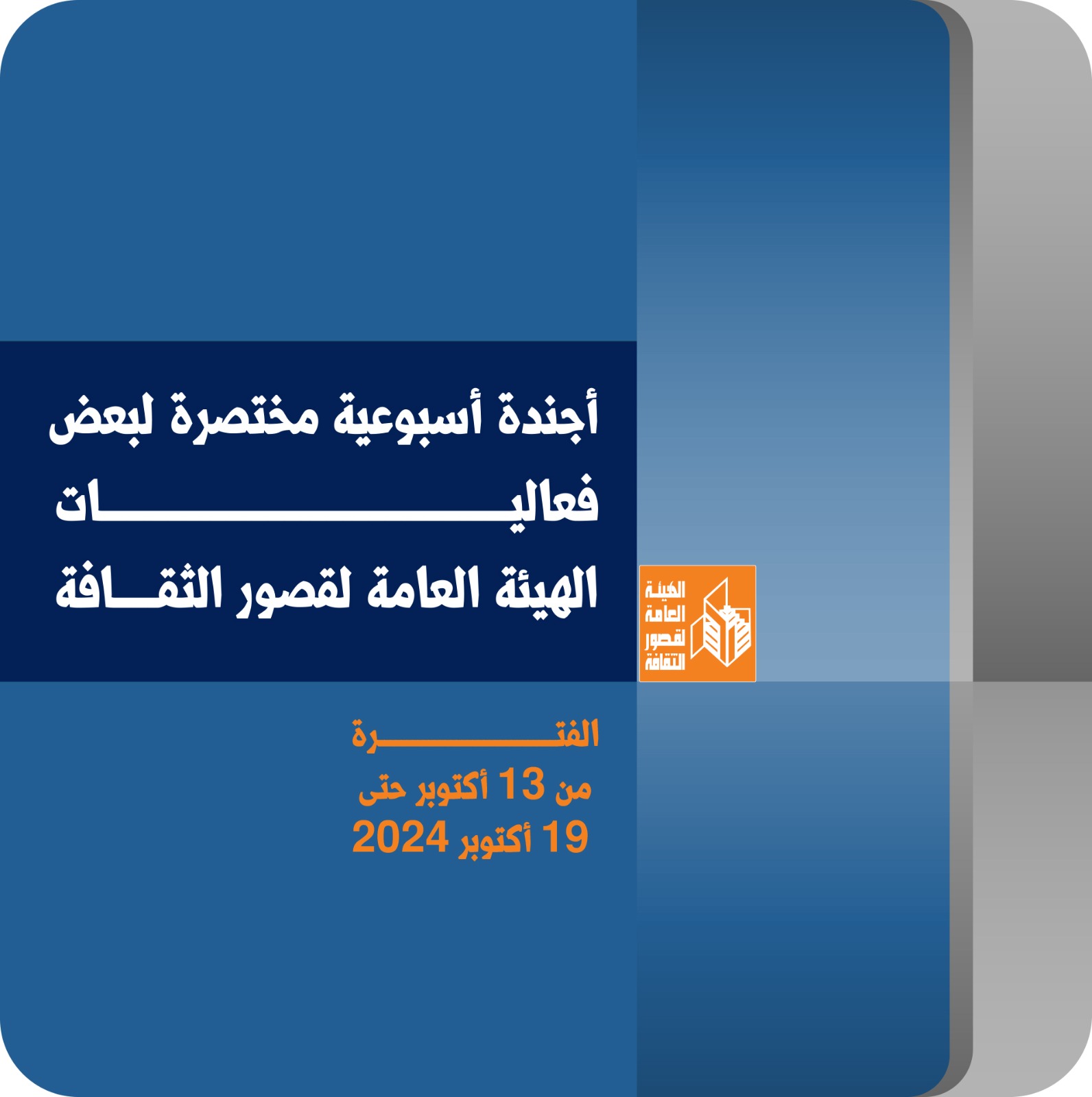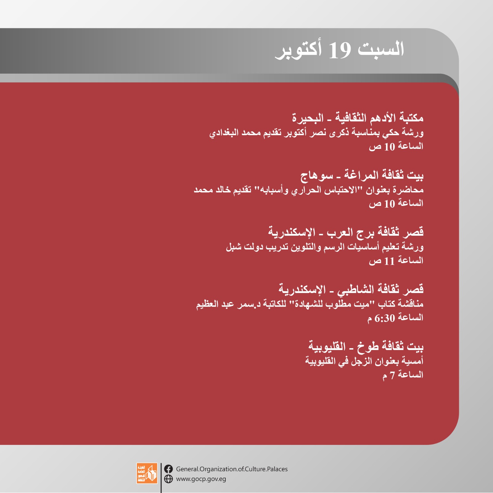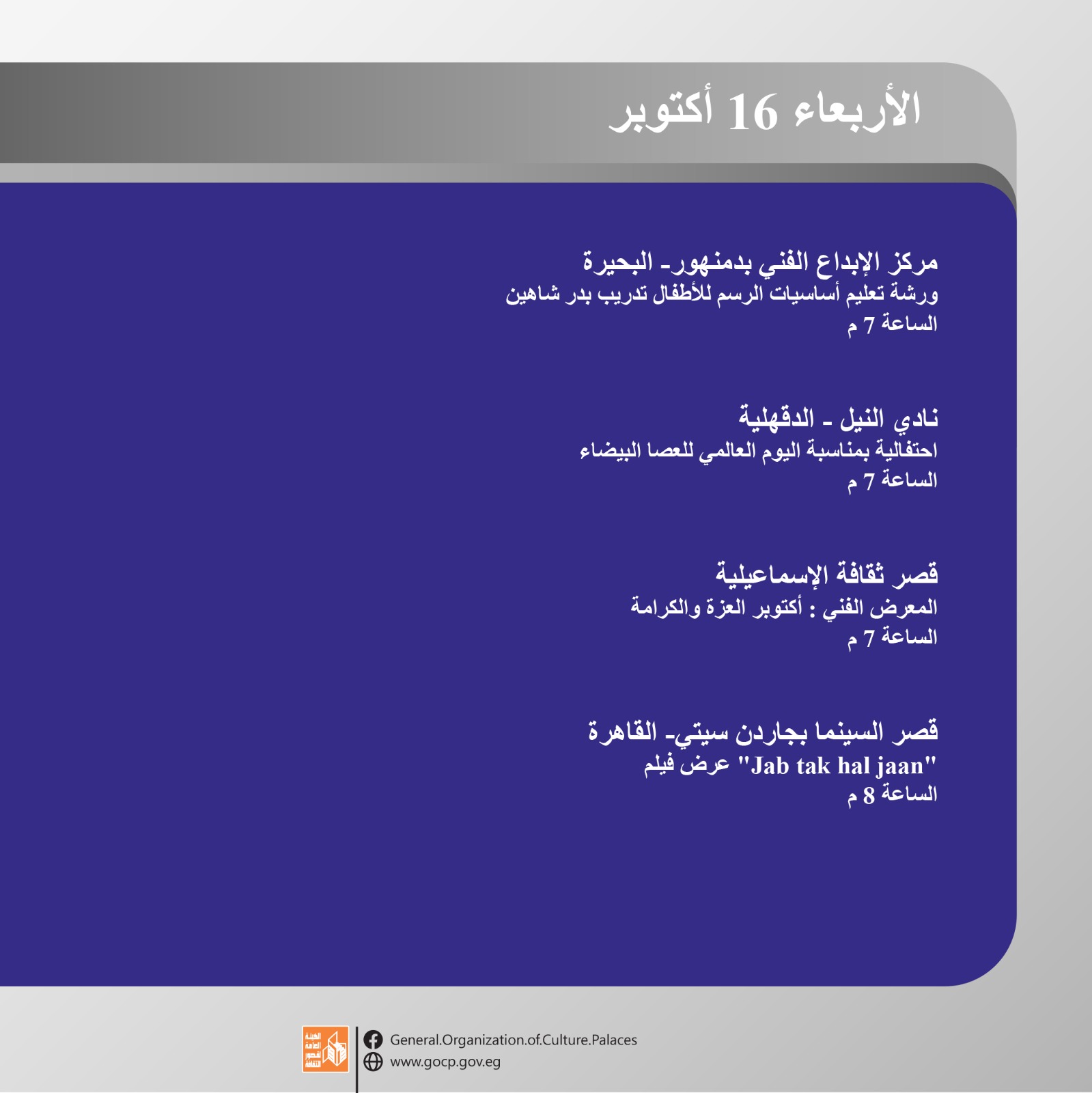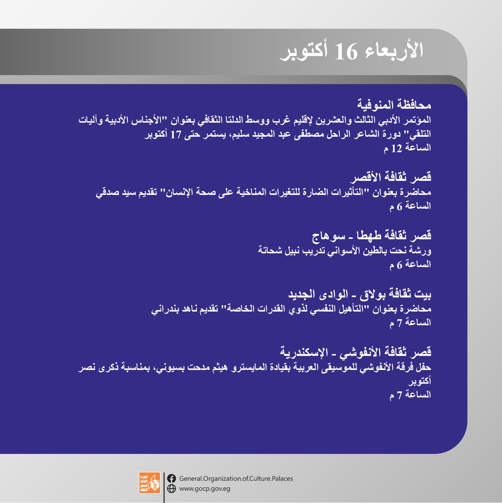 أجندة فعاليات ثقافية وفنية ثرية تقدمها هيئة قصور الثقافة، ضمن برامج وزارة الثقافة، وبرعاية الدكتور أحمد فؤاد هنو، وزير الثقافة، بإشراف الكاتب محمد ناصف، نائب رئيس الهيئة، بدءا من اليوم الأحد وحتى السبت المقبل 19 أكتوبر.