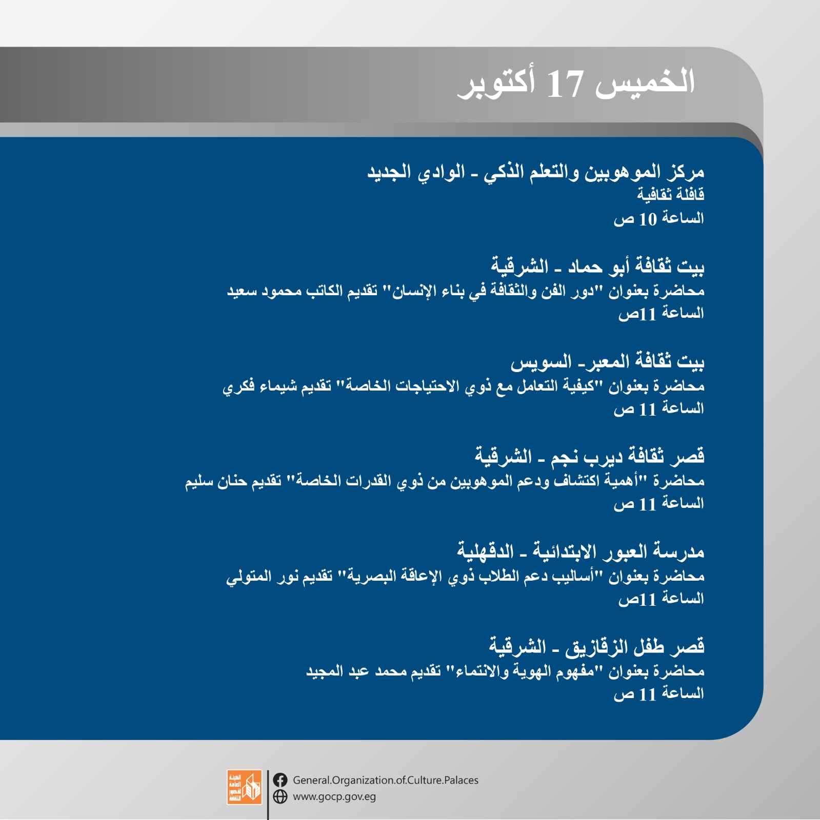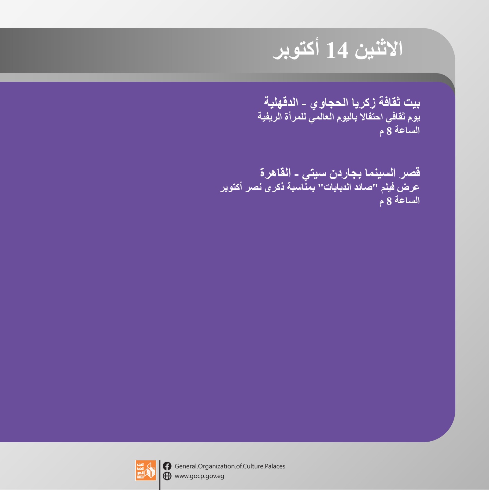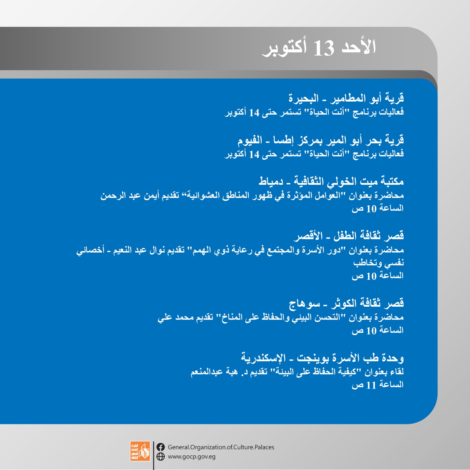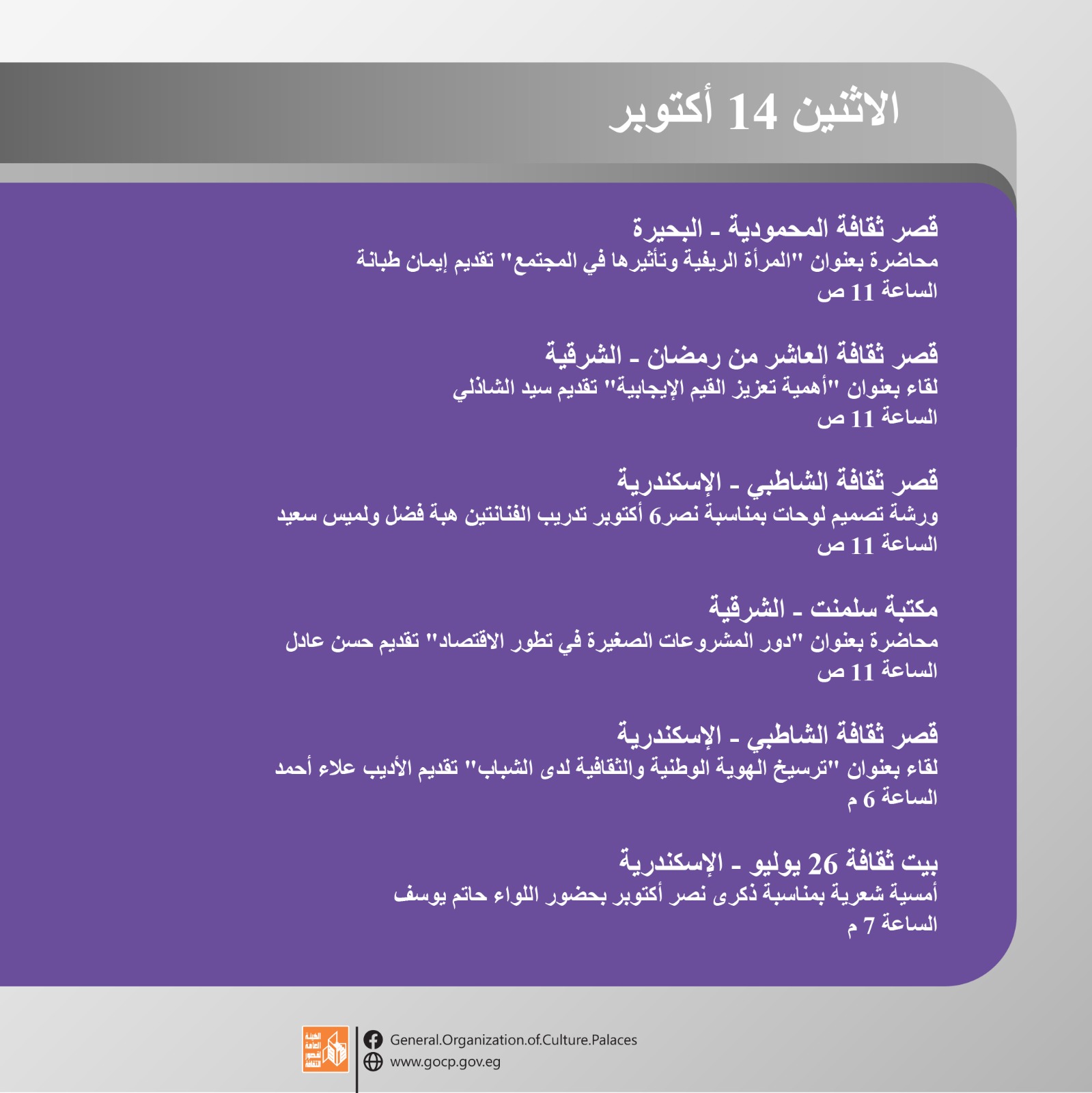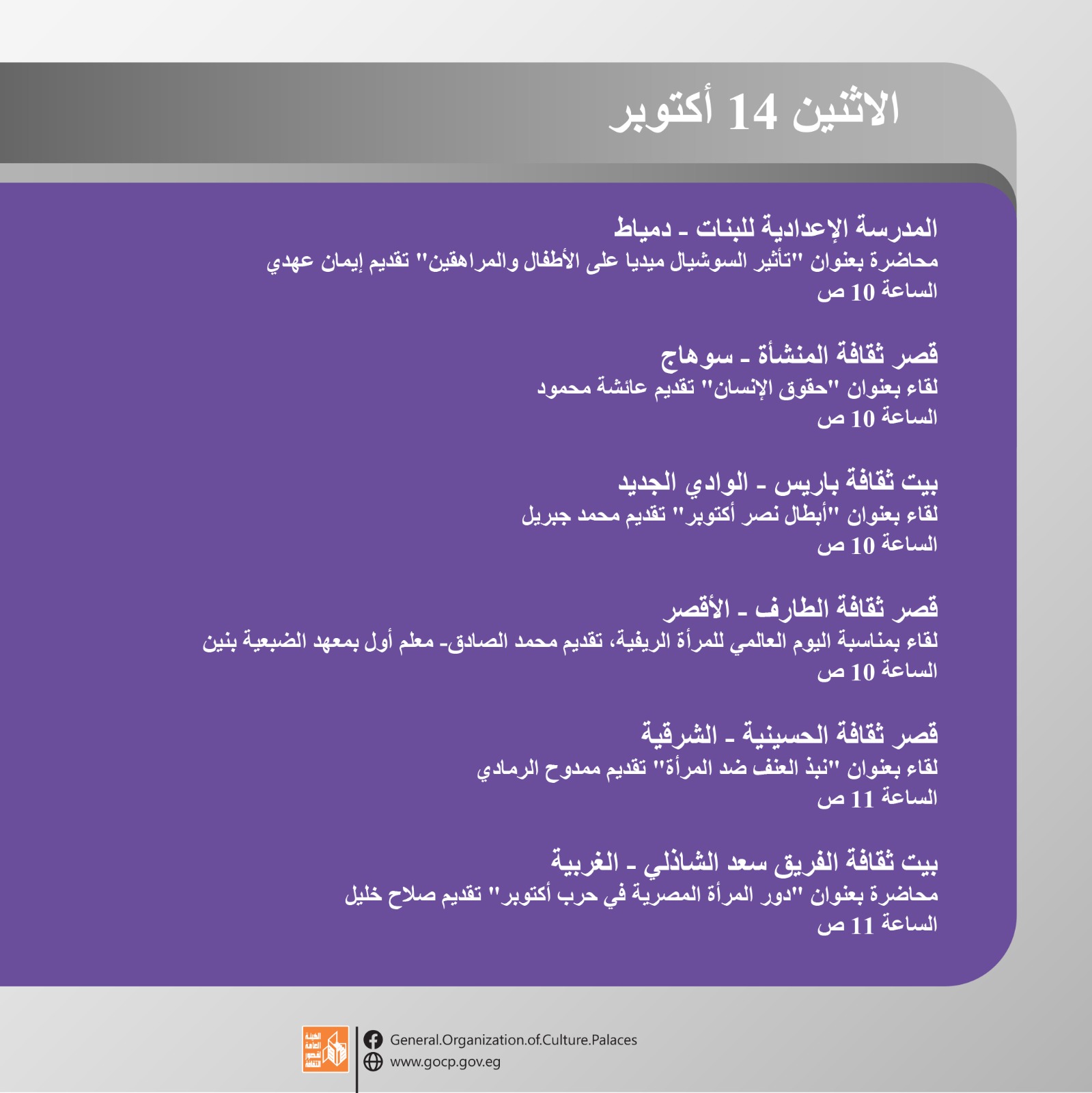 هذا وتحفل الأجندة بمجموعة من اللقاءات التثقيفية والأدبية بمشاركة نخبة من المثقفين والأدباء بالإضافة إلى الورش الفنية والحرفية بمختلف المحافظات، والاحتفالات الخاصة باليوم العالمي للمرأة الريفية، والصحة النفسية، وغيرها.