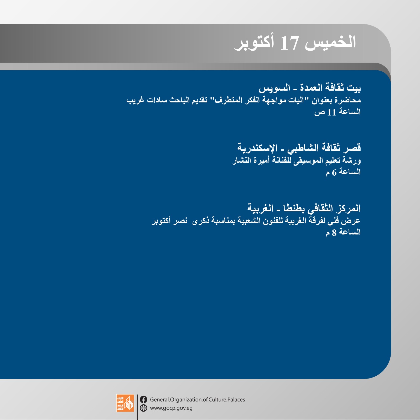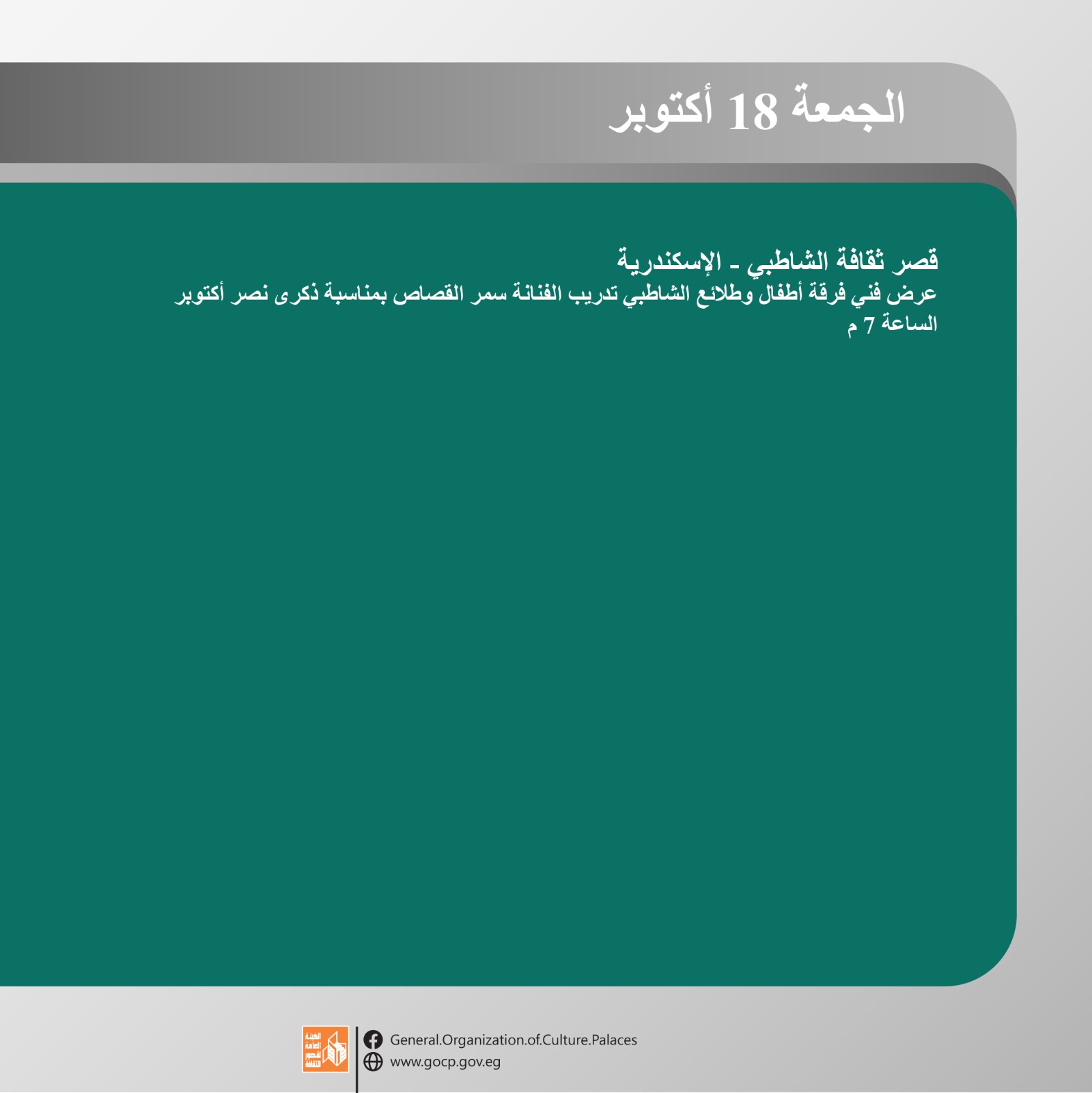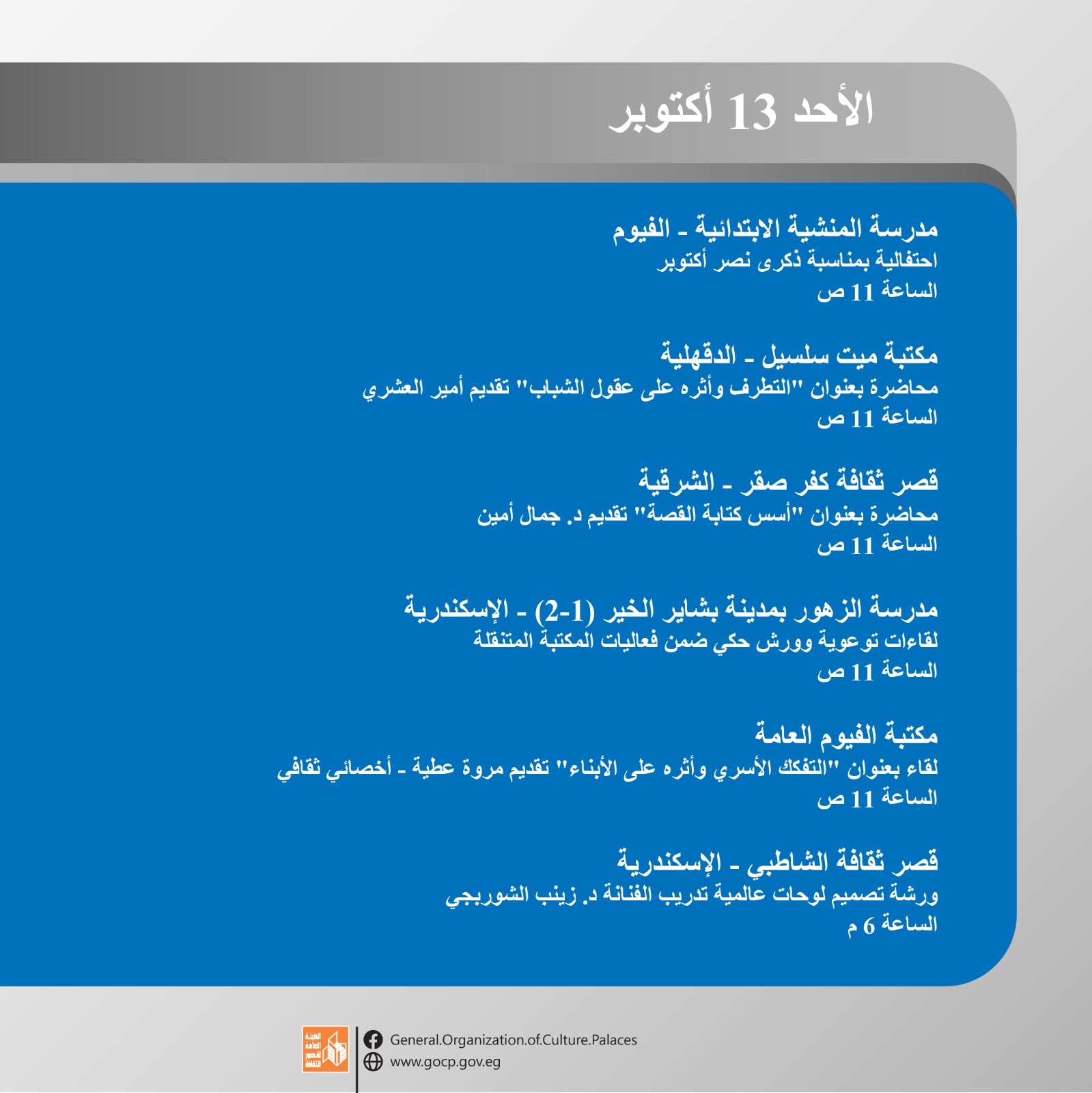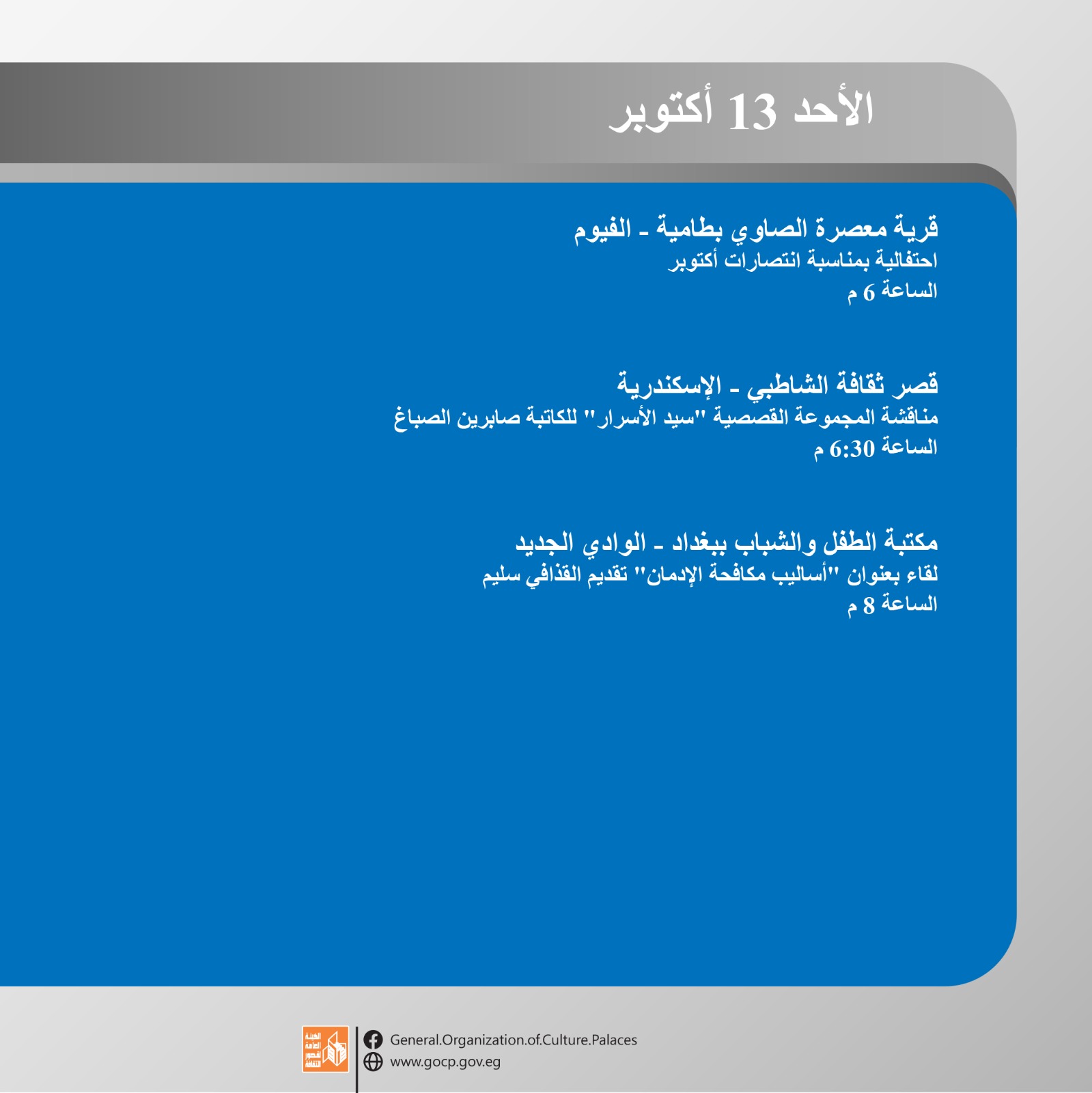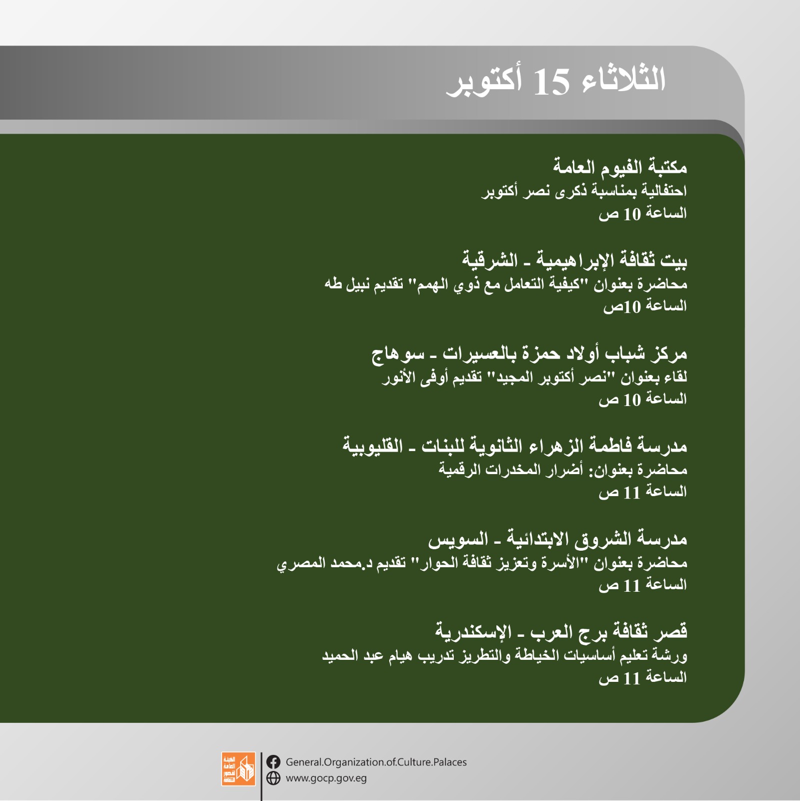 وتواصل هيئة قصور الثقافة الاحتفال بذكرى نصر أكتوبر المجيد هذا الأسبوع من خلال فعاليات مكثفة تقدم للجمهور بالمجان في محافظات الفيوم، الإسكندرية، الوادي الجديد، الغربية، سوهاج، البحيرة، والإسماعيلية وغيرها، وتشمل عددا من العروض الفنية لفرق الموسيقى العربية والفنون الشعبية، بجانب اللقاءات التثقيفية والورش الفنية، وذلك ضمن البرنامج الحافل الذي أعدته ويتضمن أكثر من 456 نشاطا ثقافيا وفنيا احتفالا بذكرى النصر المجيد.