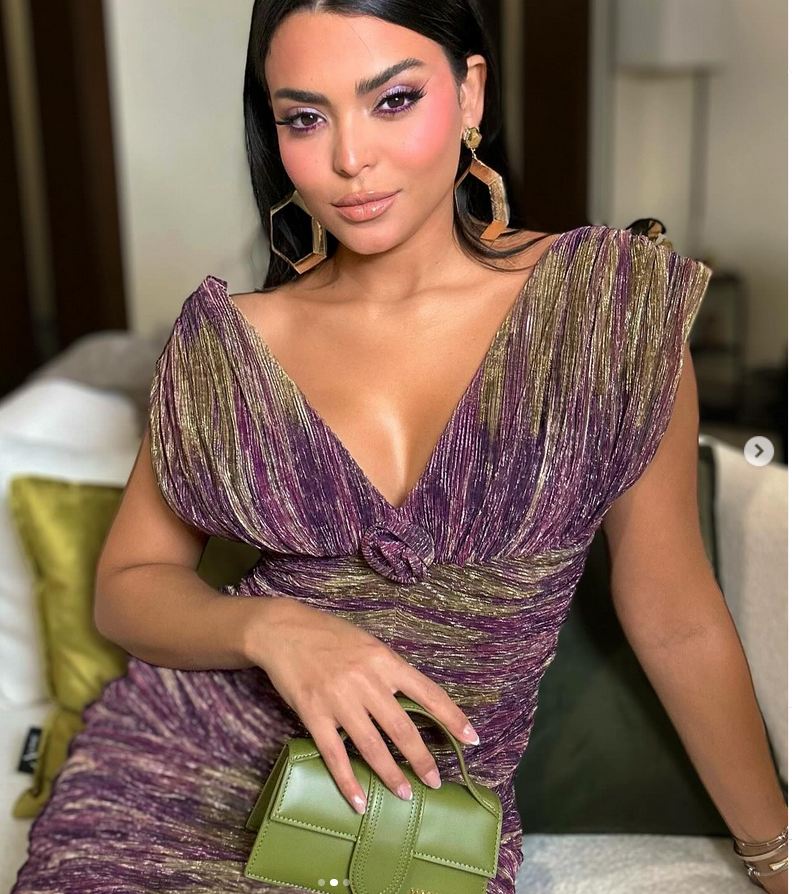 ومن الناحية الجمالية، اعتمدت تسريحة شعر جذابة فوق كتفيها ووضعت مكياجًا جذابًا مرتكزًا على ألوان النود مع تحديد عينيها بالكحل والماسكرا السوداء مع لون الكشمير في الشفاه.
