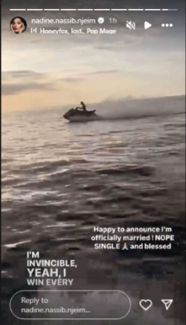 نشرت نادين نجيم مقطع فيديو لها عبر خاصية "ستوري" على تطبيق إنستجرام وهي تقود الجيت سكي في البحر وفي الخلفية اغنية unstoppable للنجمة العالمية Sia ، وأرفقت الفيديو برسالة غير واضحة جاء فيها: "يسعدني أن أعلن أنني متزوجة رسمياً، لا انا عزباء وراضية".
