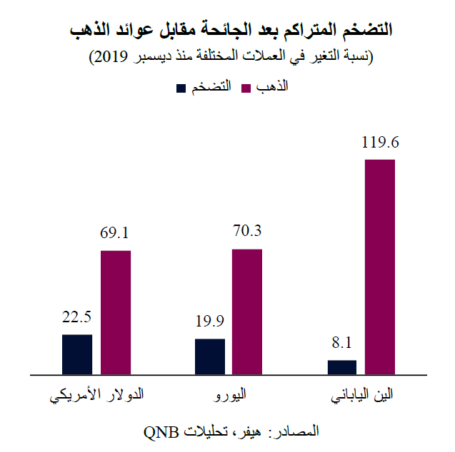 وليس من المستغرب أنه خلال هذه الفترة التي اتسمت بارتفاع التضخم، قفزت أسعار الذهب بشكل كبير مقابل أغلب العملات الرئيسية، وعوّضت بفارق كبير عن تأثير الزيادات في أسعار المستهلك.