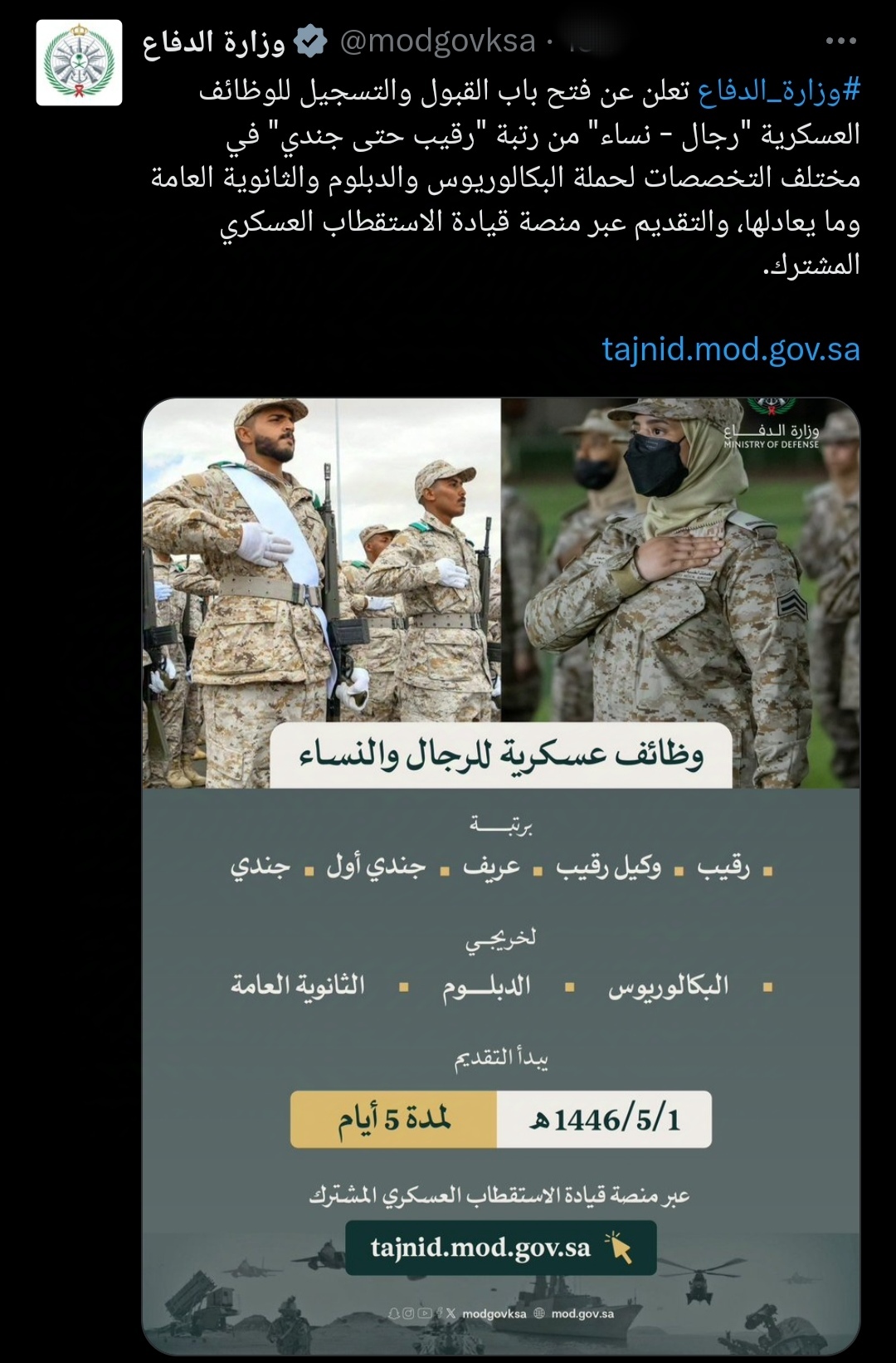 وكانت وزارة الدفاع السعودية لفتت إلى أن الوظائف متاحة في مختلف التخصصات لحملة البكالوريوس، والدبلوم، والثانوية العامة، وما يعادلها.