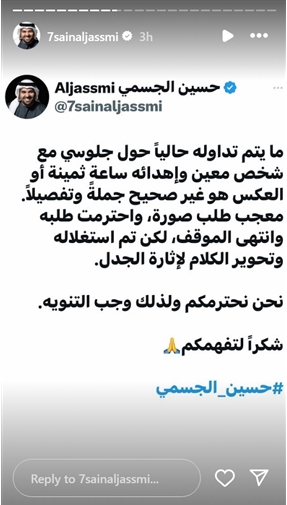 نشر حسين الجسمي تغريدة عبر حسابه الرسمي بموقع التواصل الاجتماعي "إكس"، وكتب: "ما يتم تداوله حاليًا حول جلوسي مع شخص معين وإهدائه ساعة ثمينة، أو العكس هو غير صحيح جملة وتفصيلًا، معجب طلب صورة، واحترمت طلبه وانتهى الموقف، لكن تم استغلاله وتحوير الكلام لإثارة الجدل، نحن نحترمكم ولذلك وجب التنويه".