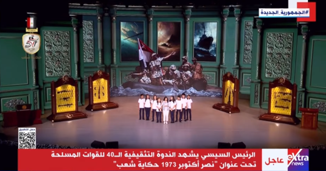 يشهد الرئيس عبدالفتاح السيسي، فيلمًا تسجيليًا حول نصر أكتوبر، تقديم الفنانة سهر الصايغ برفقة مجموعة من طلاب المدارس، وذلك خلال الندوة التثقيفية الـ40 للقوات المسلحة المصرية بمناسبة الذكرى الـ51 لنصر أكتوبر المجيد، تحت عنوان "نصر أكتوبر 1973 حكاية شعب"، والمُذاع عبر شاشة “إكسترا نيوز”.