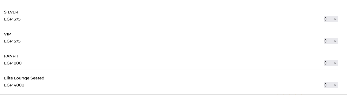 قسمت أسعار التذاكر لـ 3 فئات الاولى بقيمة 375 جنيها، والثانية 575 جنيها، الثالثة 800، الرابعة والاخيرة 4000 جنيه.