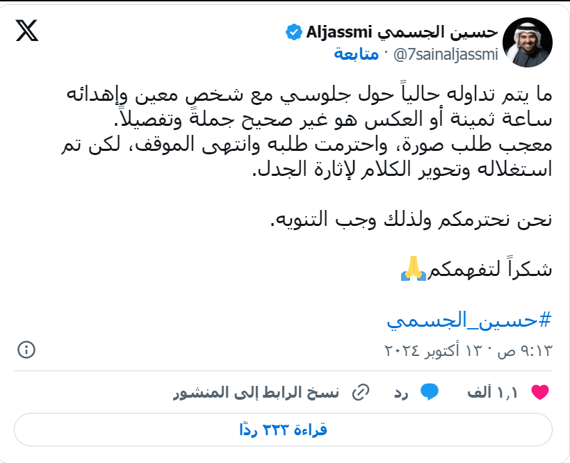 ونشر الفنان "حسين الجسمي" تغريدة عبر حسابه بموقع التدوين العالمى "إكس"، قائلاً: "ما يتم تداوله حاليًا حول جلوسي مع شخص معين وإهدائه ساعة ثمينة، أو العكس، هو غير صحيح جملةً وتفصيلًا، معجب طلب صورة، واحترمت طلبه وانتهى الموقف، لكن تم استغلاله وتحوير الكلام لإثارة الجدل، نحن نحترمكم ولذلك وجب التنويه".
