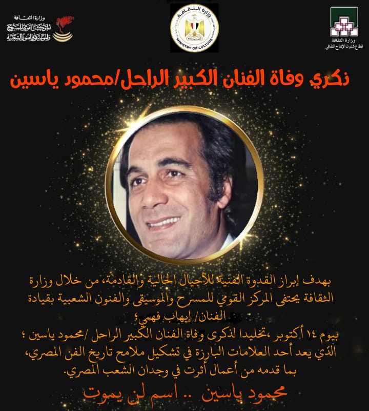 يحيي المركز القومي للمسرح والموسيقى والفنون الشعبية برئاسة الفنان إيهاب فهمي، اليوم الاثنين، بذكرى وفاة الفنان محمود ياسين.