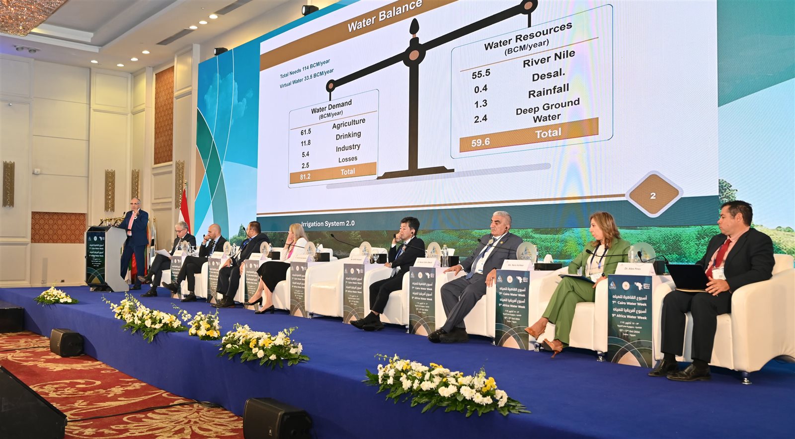 واستعرض الموقف المائى الحالي، حيث تبلغ احتياجات مصر المائية حوالى ١١٤ مليار متر مكعب من المياه سنويًا، في حين تقدر موارد مصر المائية بحوالي ٥٩.٦٠ مليار متر مكعب سنويًا (٥٥.٥٠ مليار من مياه نهر النيل – ١.٣٠ مليار من مياه الأمطار – ٢.٤٠ مليار من المياه الجوفية العميقة غير المتجددة – ٠.٤٠ مليار من تحلية مياه البحر)، مع إعادة استخدام ٢١.٦٠ مليار متر مكعب سنويًا من المياه، واستيراد محاصيل زراعية من الخارج تقابل استهلاك مائي يُقدر بحوالي ٣٣ مليار متر مكعب سنوياً من المياه.