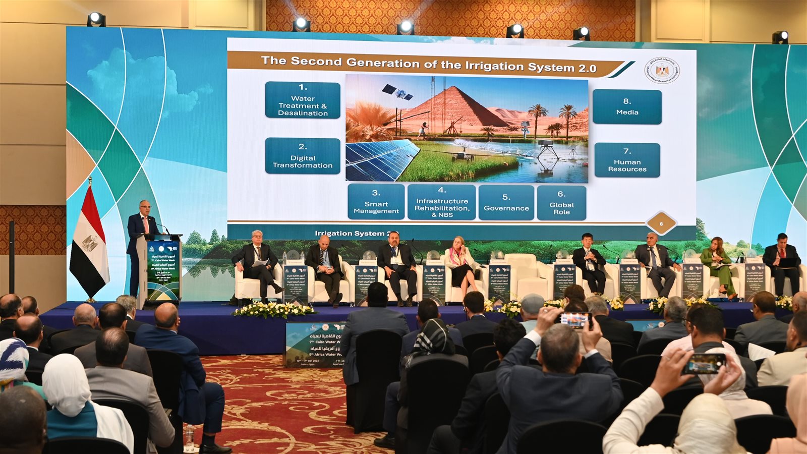 شارك الدكتور هانى سويلم وزير الموارد المائية والرى، فى جلسة "الإدارة الاستراتيجية للموارد المائية لزيادة مرونة المنظومة المائية" وخلال الجلسة تم عرض فيديو عن تاريخ الرى فى مصر منذ عصر المصريين القدماء ومرورا بنهضة مصر الحديثة فى عهد محمد على باشا الذى يعتبر صانع النهضة الكبرى التي شهدت التطوير الأول لمنظومة الري فيما يعرف بالجيل الأول لمنظومة الري.
