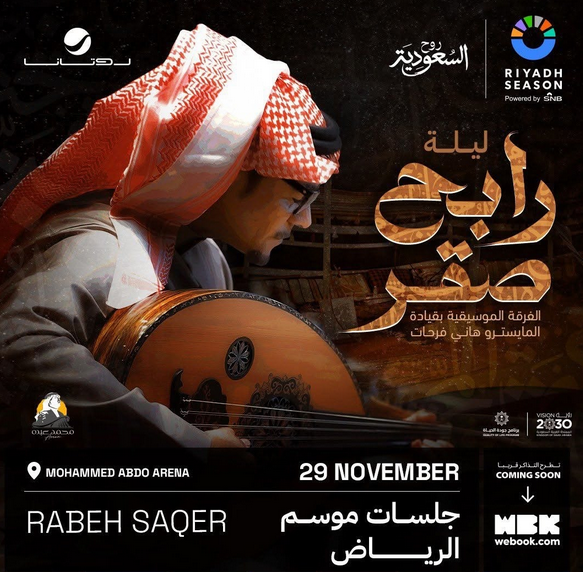 يشارك الفنان رابح صقر في جلسات موسم الرياض وذلك في 29 نوفمبر المقبل، على مسرح محمد عبده أرينا بقيادة الموسيقار محمد عبده