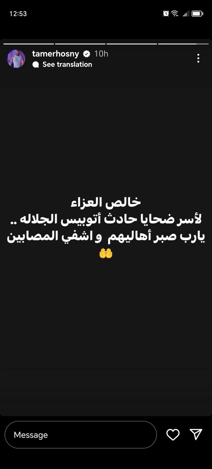 نشر الفنان “تامر حسنى” عبر حسابه على موقع “إنستغرام”: “خالص العزاء لأسر ضحايا حادث أتوبيس الجلالة، يارب صبر أهاليهم واشفِ المصابين“.
