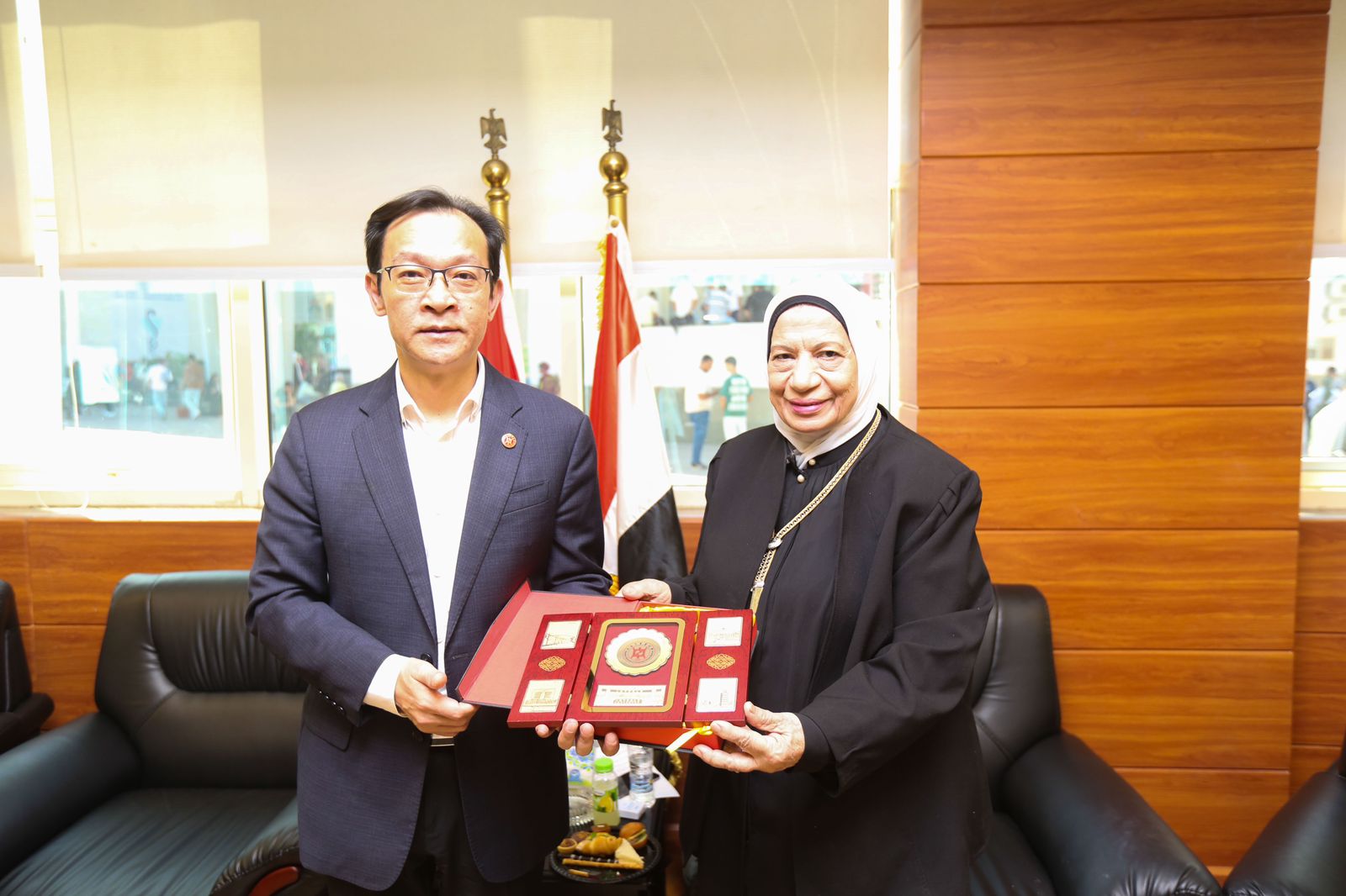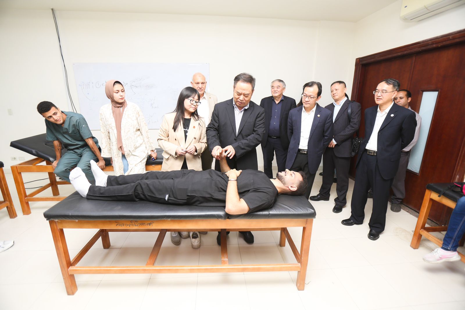 وقال إنه تعرف على أعضاء هيئة التدريس والدكتور سامي ناصف عميد كلية العلاج الطبيعي، حيث  تم مناقشة العديد من الموضوعات المشتركة من ضمنها الوخز بالإبر الصينية ومدى أهميتها في مجال العلاج الطبيعي، حيث تدرب طلاب كلية العلاج الطبيعي على ذلك أثناء تدريبهم بجامعة شنغهاي وقد حصلت إحدى الطالبات على منحة دراسة ماجيستير الوخز بالإبر الصينية بجامعة شنغهاي والجامعة مستعدة لاستقبال المزيد من الطلاب لدراسة الماجيستير .