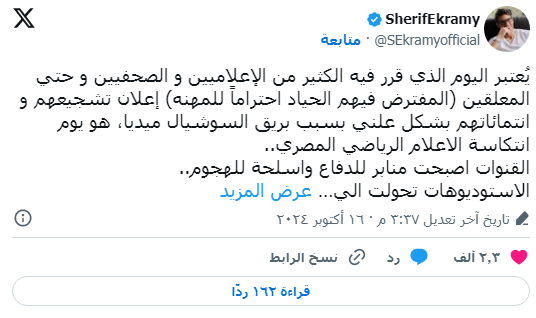 كتب شريف إكرامي: “يُعتبر اليوم الذي قرر فيه الكثير من الإعلاميين والصحفيين وحتى المعلقون (المفترض فيهم الحياد احترامًا للمهنة) إعلان تشجيعهم وانتماءاتهم بشكل علني بسبب بريق السوشيال ميديا، هو يوم انتكاسة الإعلام الرياضي المصري”.