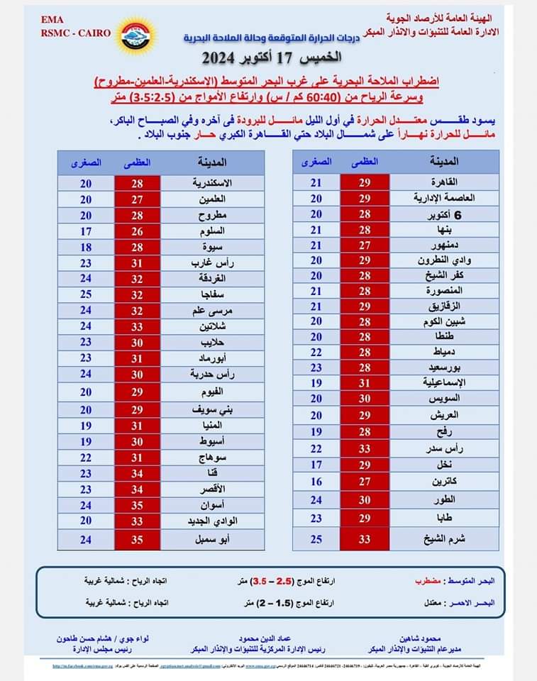 يشهد اليوم الخميس الموافق 17 أكتوبر، طقس مائل للحرارة نهارا على شمال البلاد وحتى القاهرة الكبرى، حار جنوبا، كما يكون معتدل الحرارة في أول الليل مائل للبرودة في آخره.