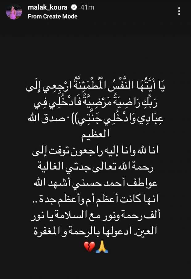 ملك قورة تعلن وفاة جدتها بكلمات مؤثرة: «أعظم أم»