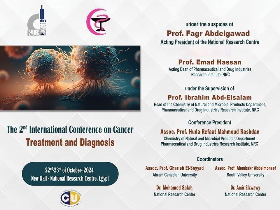 ويأتي المؤتمر تحت رعاية الأستاذة الدكتورة فجر عبد الجواد القائم بأعمال رئيس المركز القومي للبحوث والأستاذ الدكتور عماد حسن، القائم بأعمال عميد معهد بحوث الصناعات الصيدلية والدوائية بالمركز القومي للبحوث وفي شهر أكتوبر كونه شهر التوعية بسرطان الثدي.