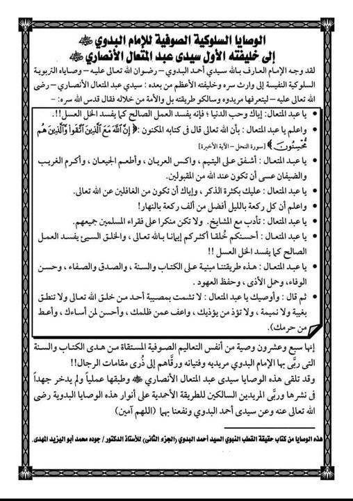 وأضافت المشيخة إنها سبع وعشرون وصية من أنفس التعاليم الصوفية المستقاة من هدى الكتاب والسنة التي ربي بها الإمام البدوي مريديه وفتيانه ورقاهم إلى ذرى مقامات الرجال !! وقد تلقى هذه الوصايا سيدى عبد المتعال الأنصاري الله وطبقها عملياً ولم يدخر جهداً في نشرها وربى المريدين السالكين للطريقة الأحمدية على أنوار هذه الوصايا البدوية رضى الله تعالى عنه وعن سيدى أحمد البدوي ونفعنا بهما (اللهم آمين) هذه الوصايا من كتاب حقيقة القطب النبوي السيد أحمد البدوي الجزء الثاني للأستاذ الدكتور / جوده محمد أبو اليزيد المهدي.